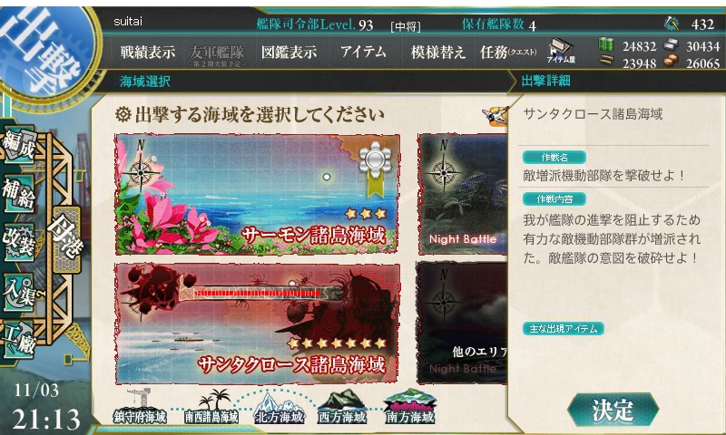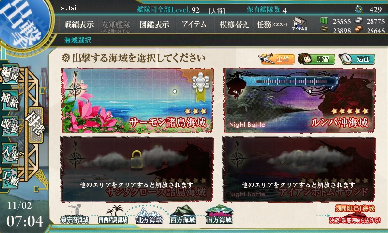E-4が夜戦マップ&高速戦艦でルート固定なので、行けるのかどうか不安なところですが…