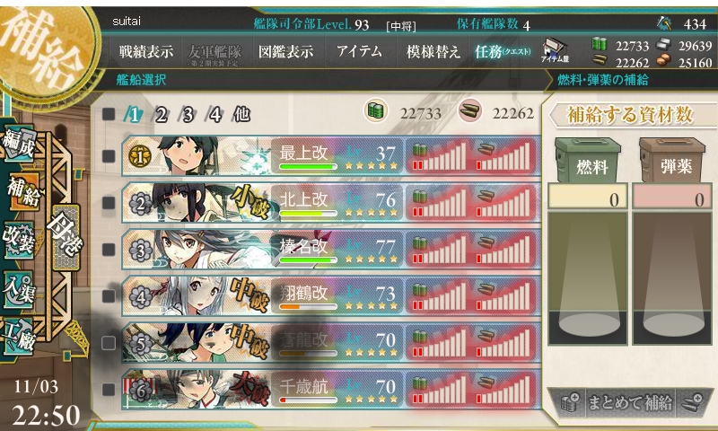 残りが燃料・弾薬が22k、鉄鋼30k、ボーキ25k程度、といったところ。