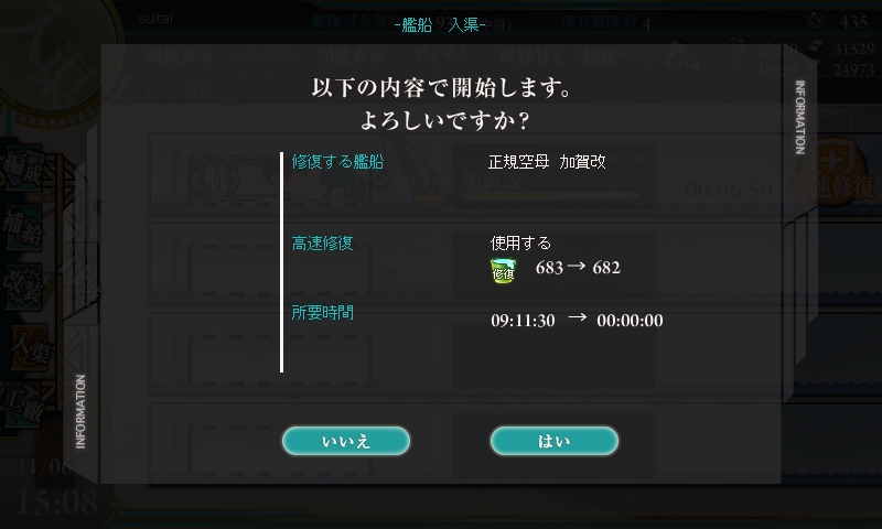 ボーキが増えたのは、夜戦MAPなので、空母を連れて行くわけには行かなかったからです。