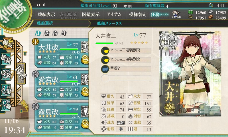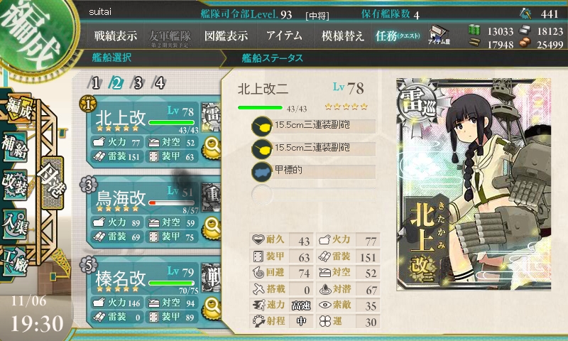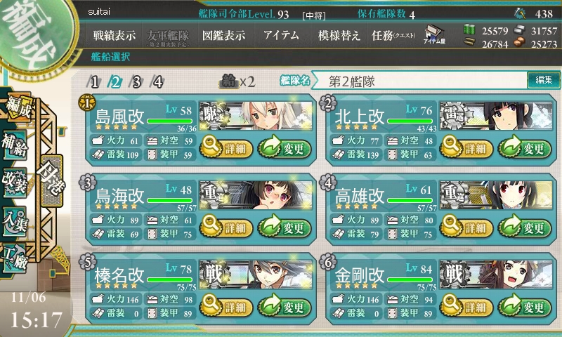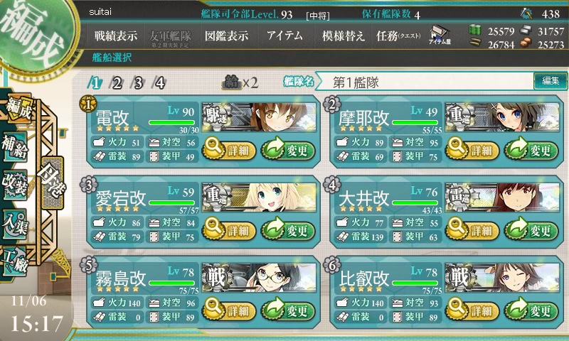 挑戦前です。2艦隊編成して、交互に出撃し、疲労が貯まるのを防ぐ作戦です。