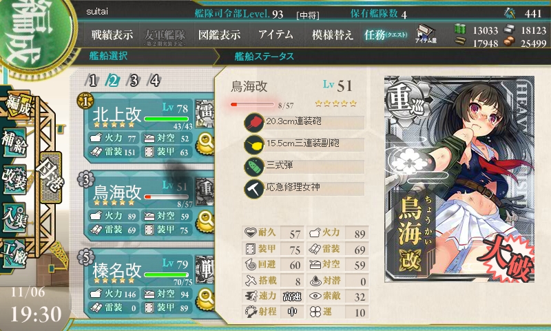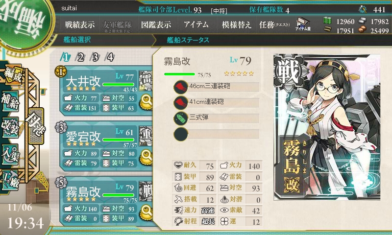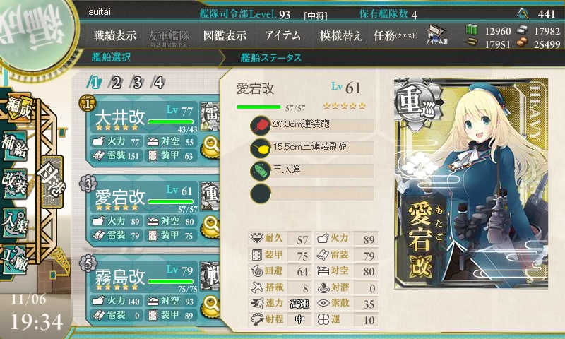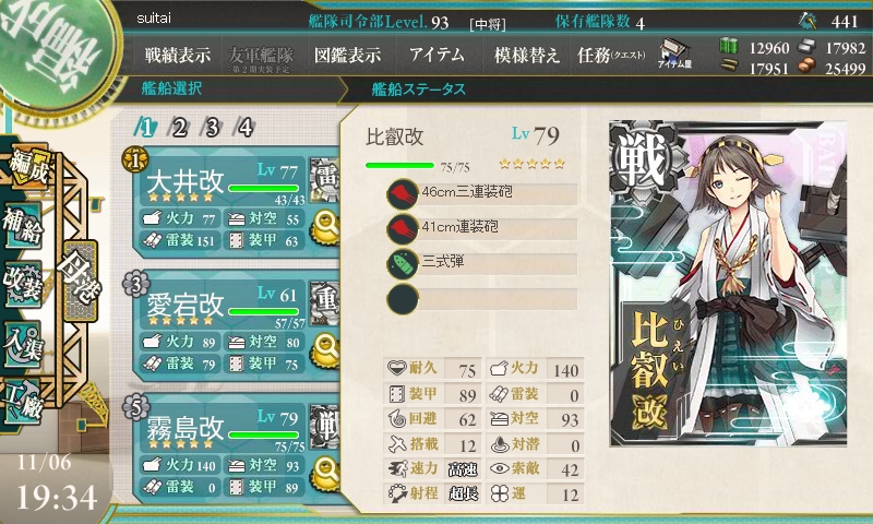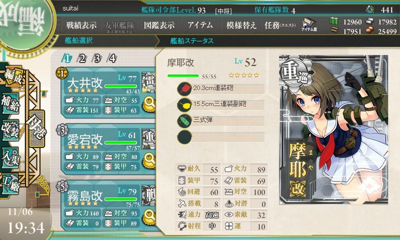 との事だったので、各艦、三式弾を装備し、連撃装備で構成しました。