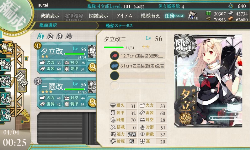 複縦はそんな感じやね。単縦に比べて火力は劣るものの、回避とかが上がるから、道中はダメを減らすためにも、複縦を使うって感じかな。