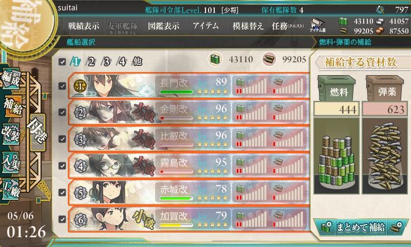 大破した戦艦は明日のデイリー任務を兼ねて入渠させるから、その分の消費でさらに増えます