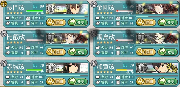 道中はどっこいどっこい(大破するときには大破する)と言った感じでしたが、全体的に戦艦の練度のほうが高いためか、戦艦4空母2のほうが自分はBOSS到達率は高く感じました。