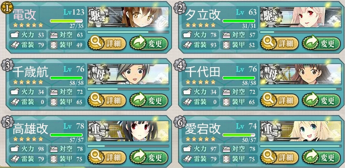 支援艦隊は駆逐艦および重巡は主砲できる限りと電探、軽空母は爆撃機ガン積み