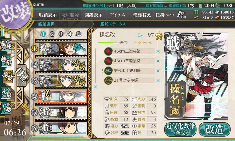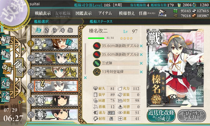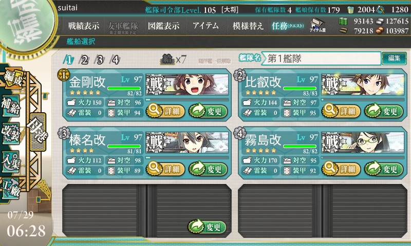 資源は燃料とボーキが100k近く、鉄130k、バケツ2kと過去最大級の量を蓄えています。