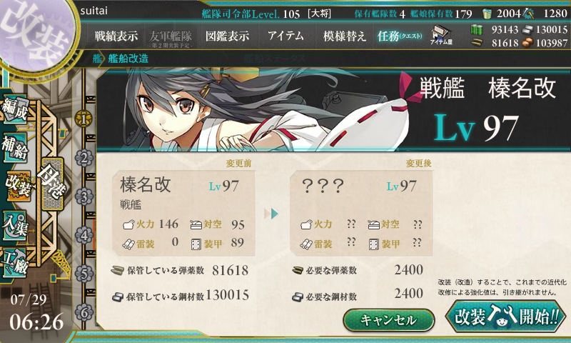 金剛に改二が実装されてから9か月近く。ようやく姉妹艦最後の榛名の改二が来たのです。