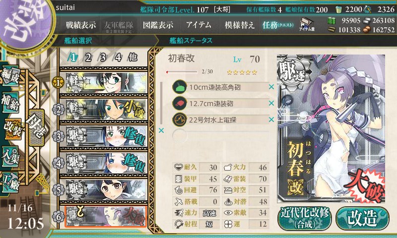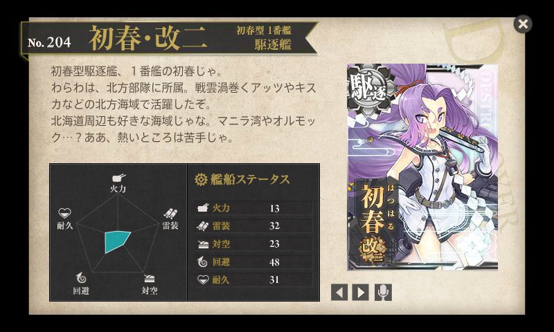 初春も1か月くらい前に実装されてようやく改二になりました。