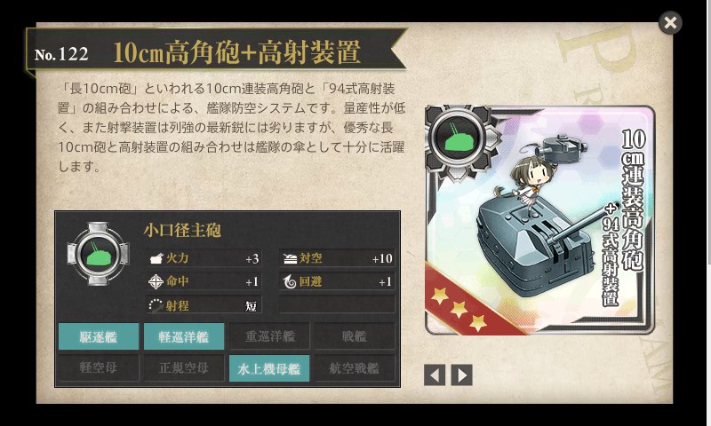 この装備と高角砲やら対空電探やらを組み合わせると対空カットイン?が発動するようになるそうです。