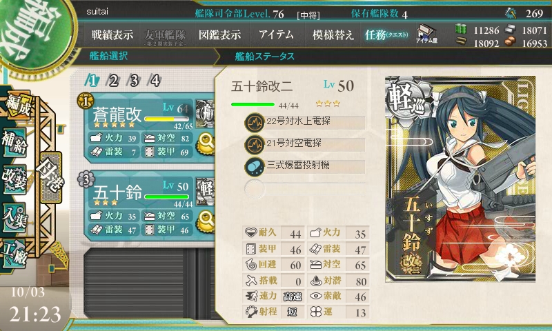 一番育っている娘は金剛さんです。現在79Lv。