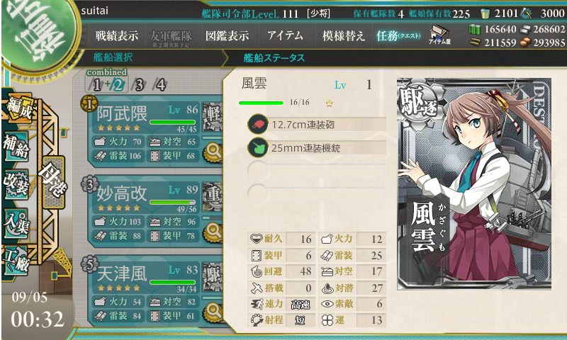 資材は20~30万程度、バケツも2500弱あったため、時間さえあれば海域攻略は可能な状態でした。